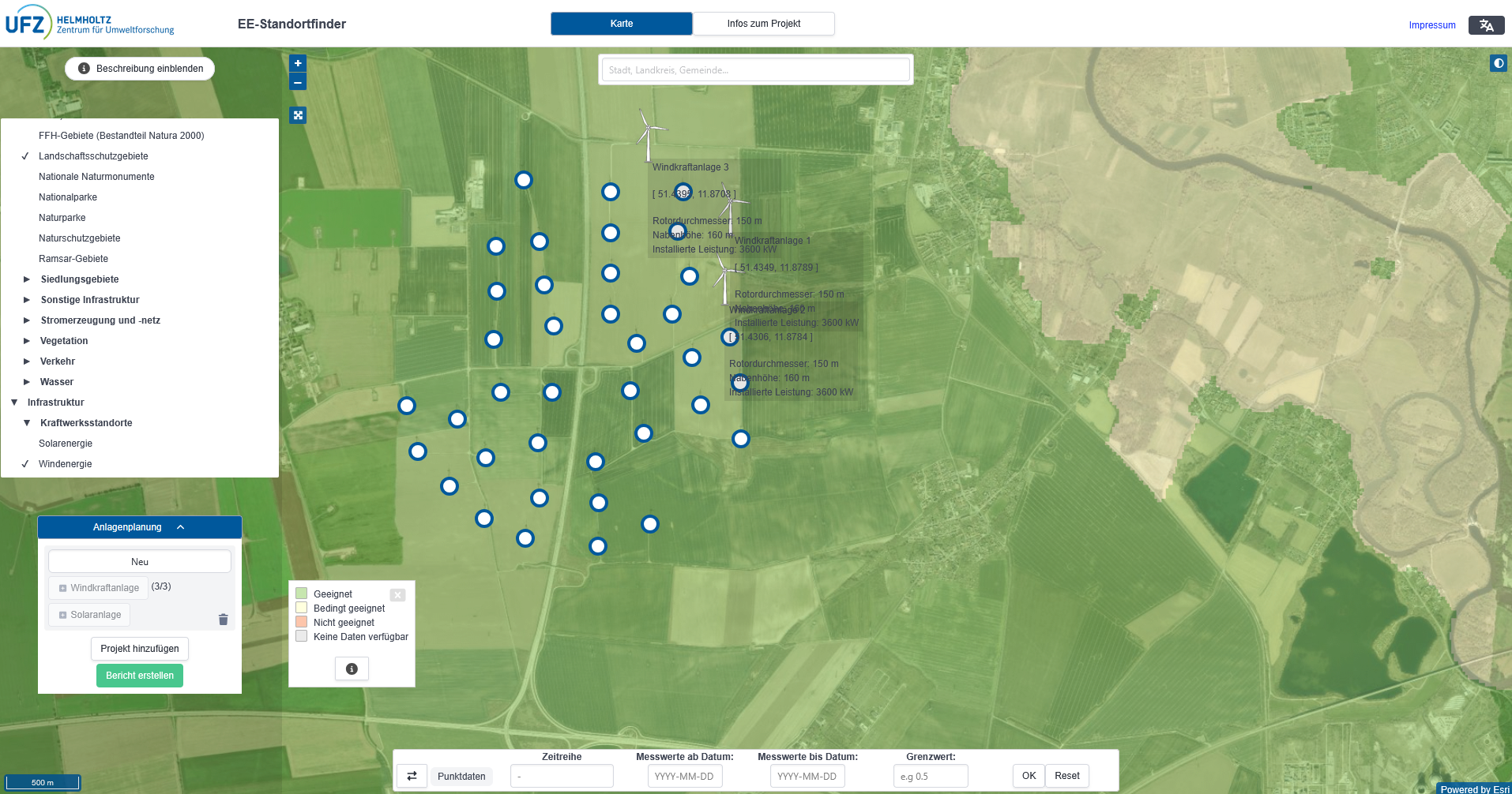 Bei der Errichtung neuer Anlagen zur Erzeugung erneuerbarer Energien (EE) wie Wind- und Photovoltaikanlagen sind die Standorte besonders relevant: Sie bestimmen maßgeblich den Energieertrag, die Wirtschaftlichkeit und die technische Umsetzbarkeit. Zugleich beeinflussen sie Umweltwirkungen, Genehmigungsfähigkeit, Netzintegration und die Akzeptanz vor Ort und sind damit entscheidend für den langfristigen Erfolg eines Projekts. Ziel des Projekts „EE-Standortfinder“ ist es, eine interaktive Webanwendung bereitzustellen, die über die Eigenschaften von potenziellen Anlagenstandorten informiert.