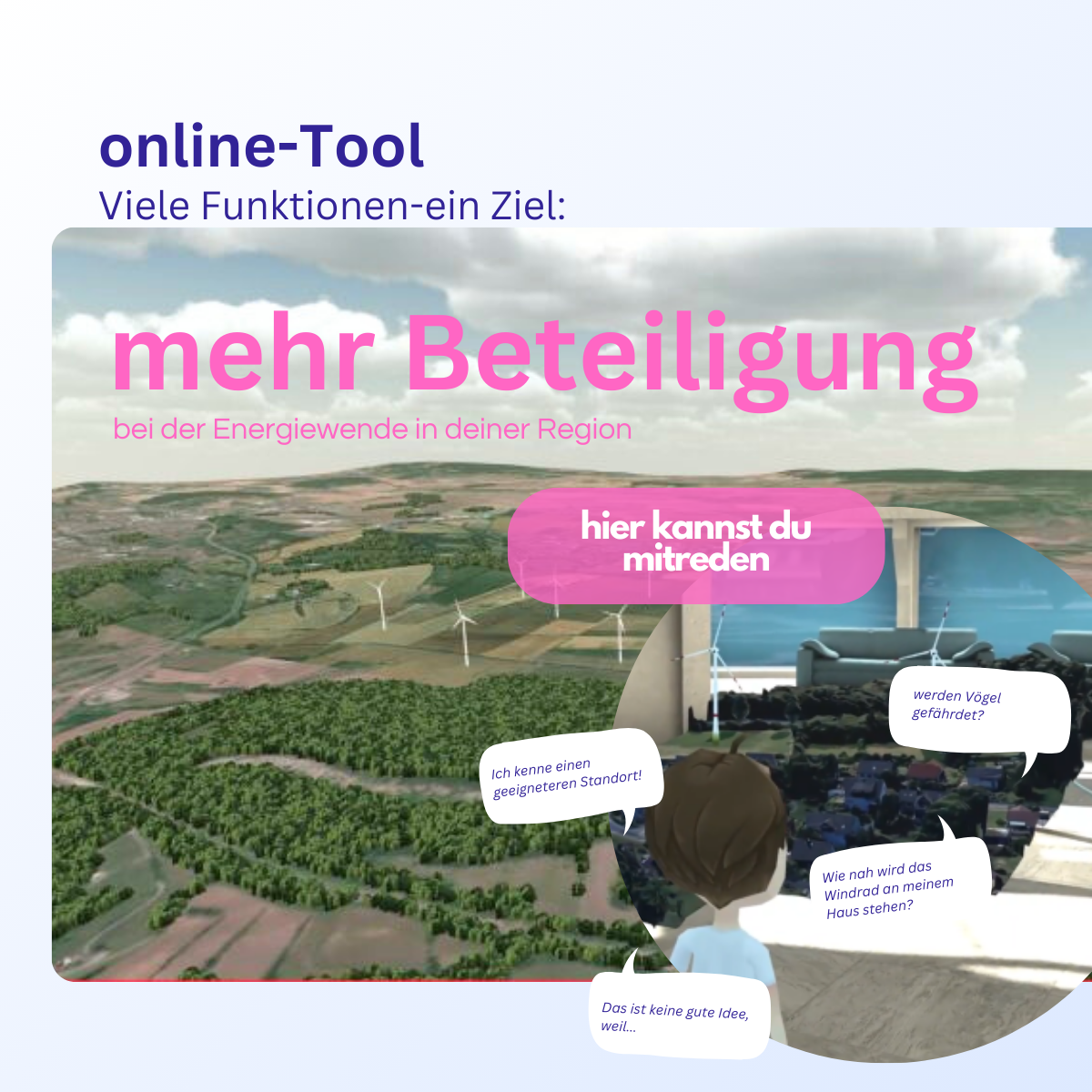 ENVIKO hat eine innovative und kreative 3D-Visualisierung als interaktives, partizipatives Tool realisiert: Windpark- und andere Projekte lassen sich in realitätsnahen Landschaften erkunden, begleitet von geprüften Kennzahlen wie CO₂-Bilanz und Energieertrag. So werden Planungen verständlicher und vor Ort greifbar. Ergänzend integriert das Tool Dialogfunktionen für Fragen, Feedback und Abstimmungen, deren Ergebnisse in die Auswertung zurückflossen. Ziel war es, die Energiewende schneller und zugleich inklusiver zu gestalten.